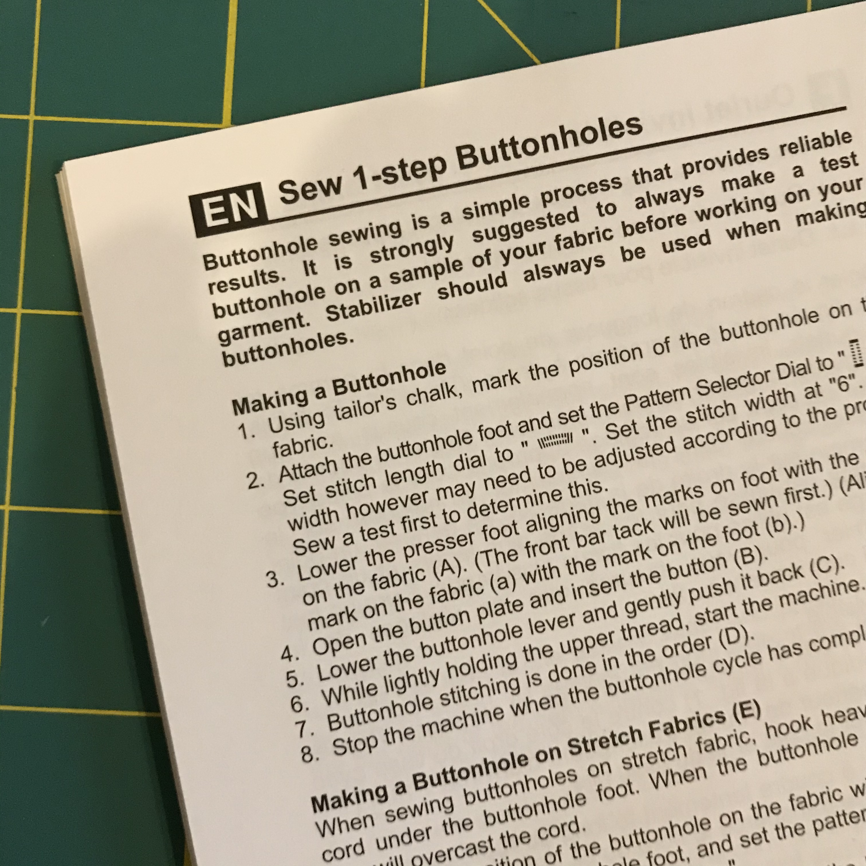 I was making a duvet cover the other night and needed to put some buttonholes in it. I very rarely make buttonholes so I had to consult the manual for my sewing machine on how to use its buttonhole feature. It touted a 1-step buttonhole feature and then proceeded to explain how to use it in eight steps. I kind of felt lied to.