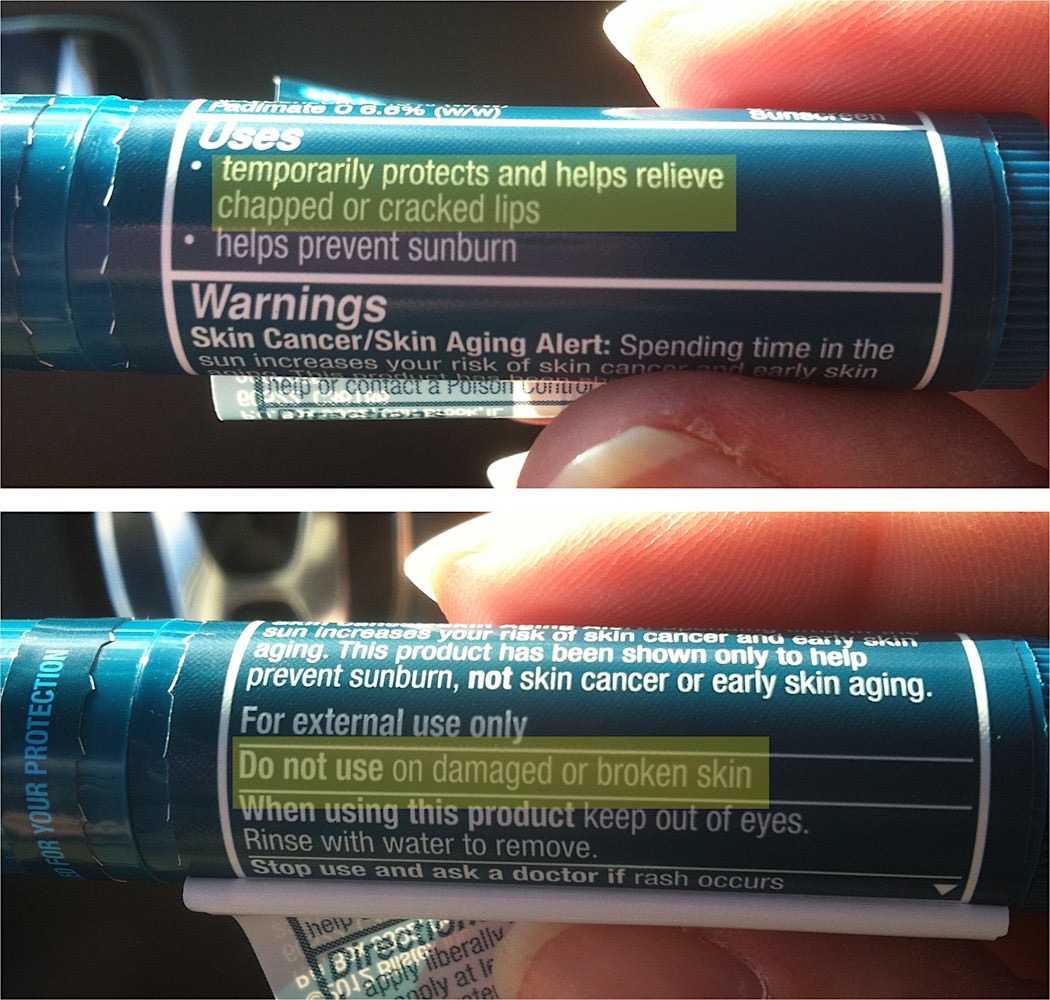 I realize that this is a CYA move on the part of lawyers for the chapstick company but just take a minute to really think about it. Chapped lips are damaged and broken skin…