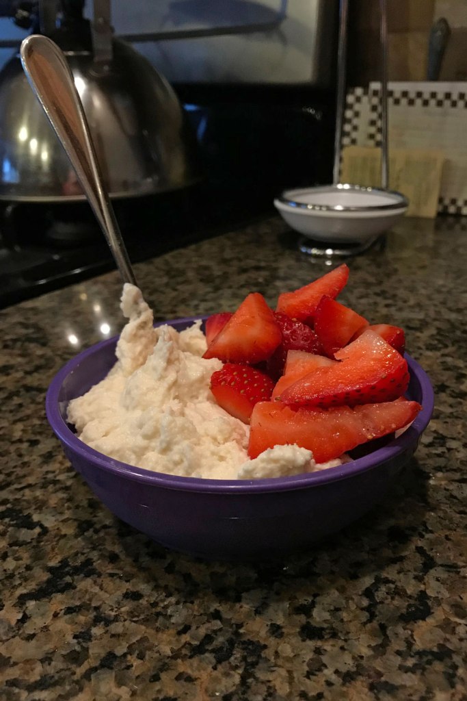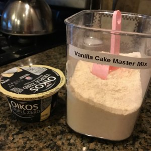 My first attempt involved THM-compatible versions of all three ingredients: Sheri Graham’s Vanilla Cake Master Mix*, a single-serve container of Oikos Triple Zero Vanilla Greek Yogurt, and some homemade whipped cream.