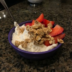 And I’ll confess, sometimes I just eat it straight up with a spoon. Tastes like cake batter. For a snack, I stick to eating half the batch with berries. The other half gets put in the fridge for a snack the next day. Sometimes though, I have it for breakfast. In that case, I eat the entire batch with 1/2 cup of berries and about 1/4 cup of homemade granola.